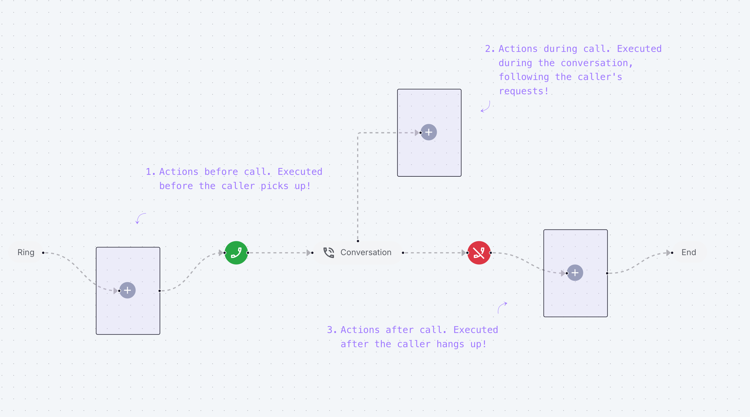 Once the call starts and throughout its duration, you can equip your agent with numerous actions.These capabilities allow you to precisely configure how the agent accesses additional information, manages call transfers, determines call termination conditions, and optimizes interactions with IVR systems and hold messages.It is in this phase that actions reveal their maximum potential, offering a multitude of automation possibilities. This flexibility can sometimes complicate design, but our platform has been optimized to make this configuration as intuitive as possible.