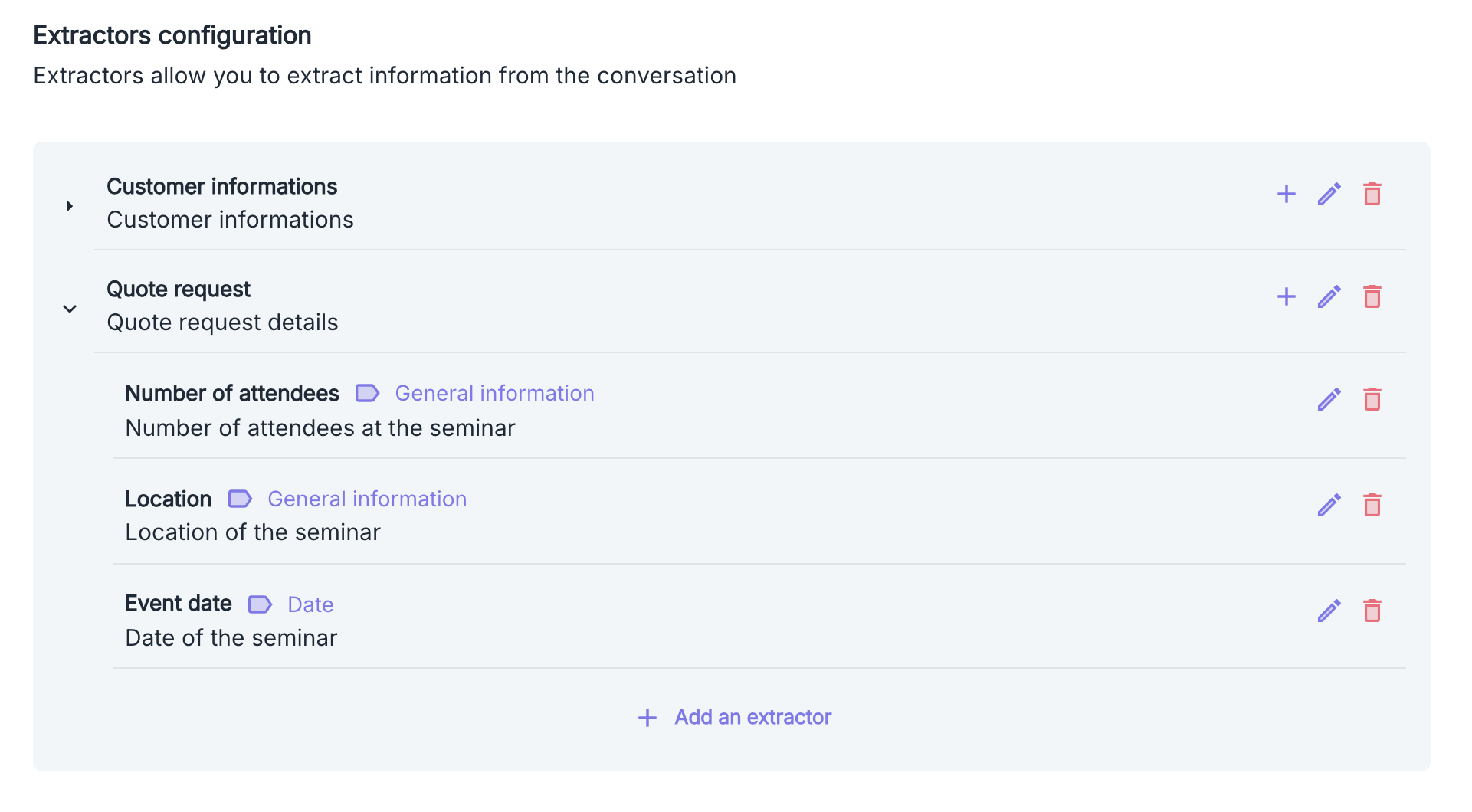 - Quote Request - A group extractor for quote requests, containing three sub-extractors: