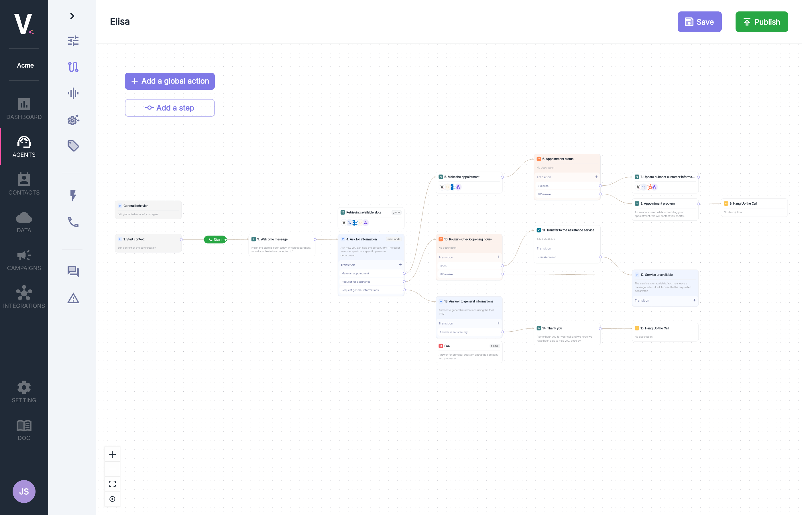 To create your conversational graph:- Adding Global Actions: Use the