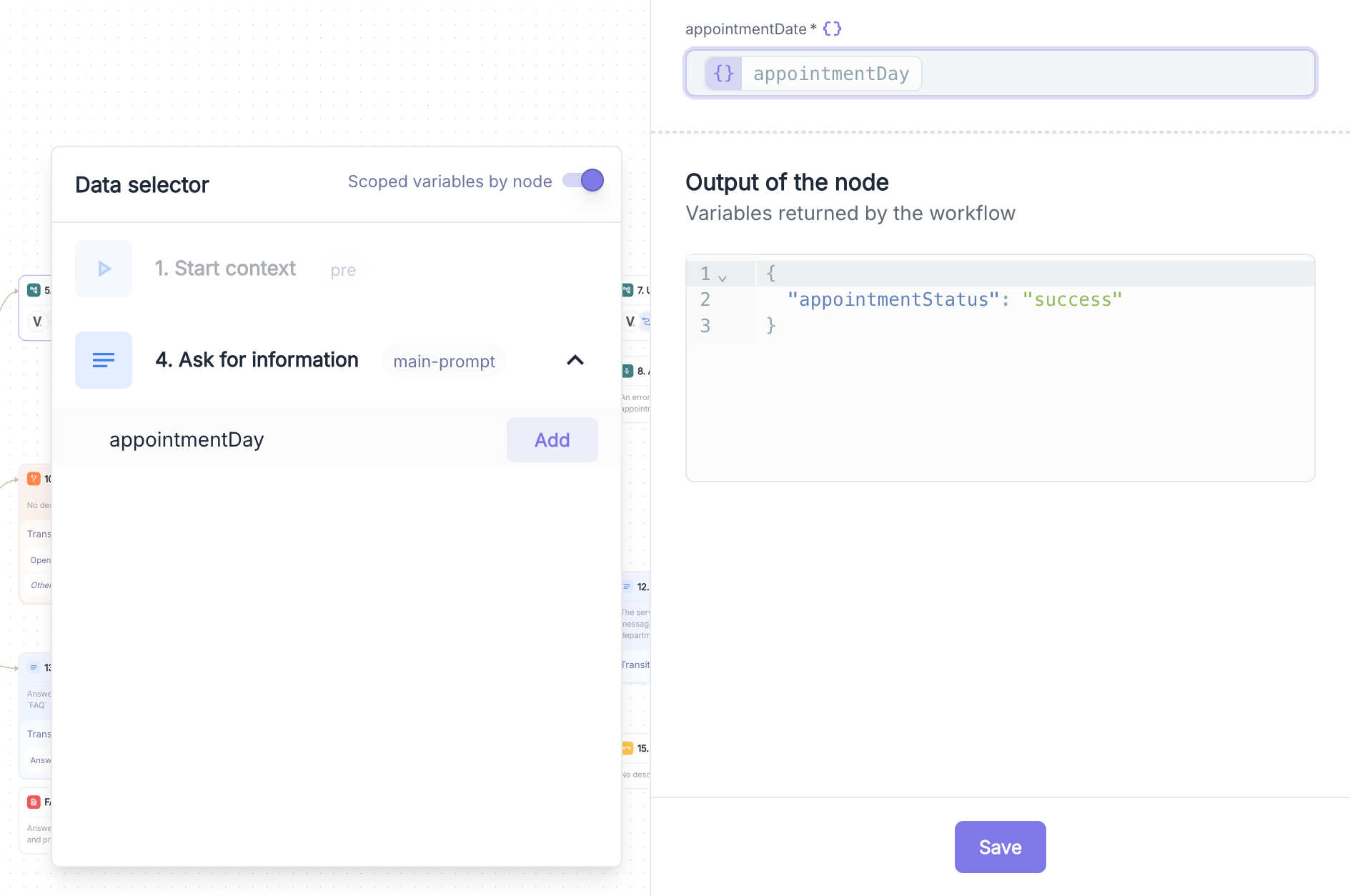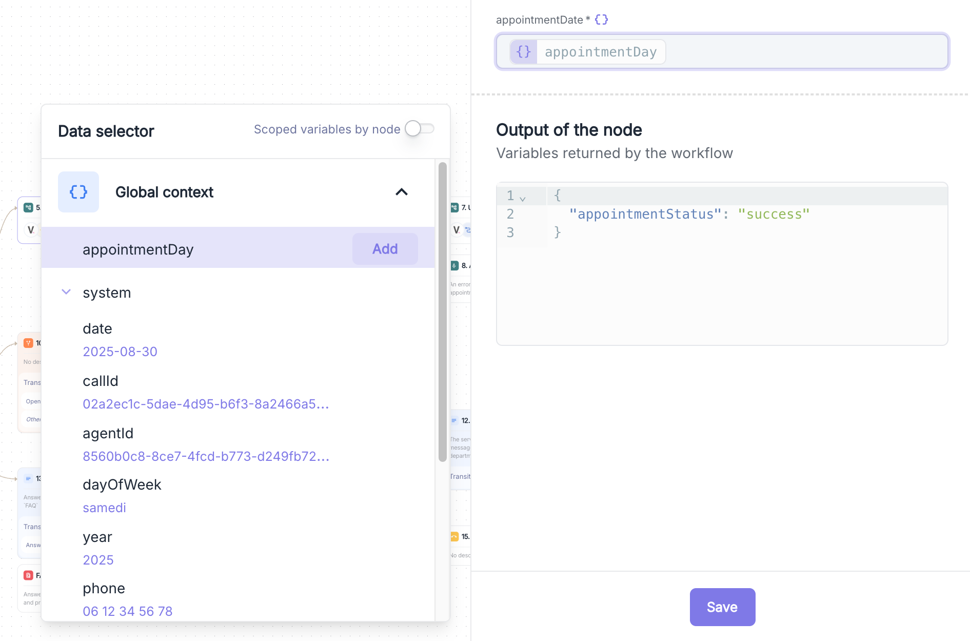 "Your appointment on {appointmentDay} at {appointmentTime}") - System variables: Use of contextual data (